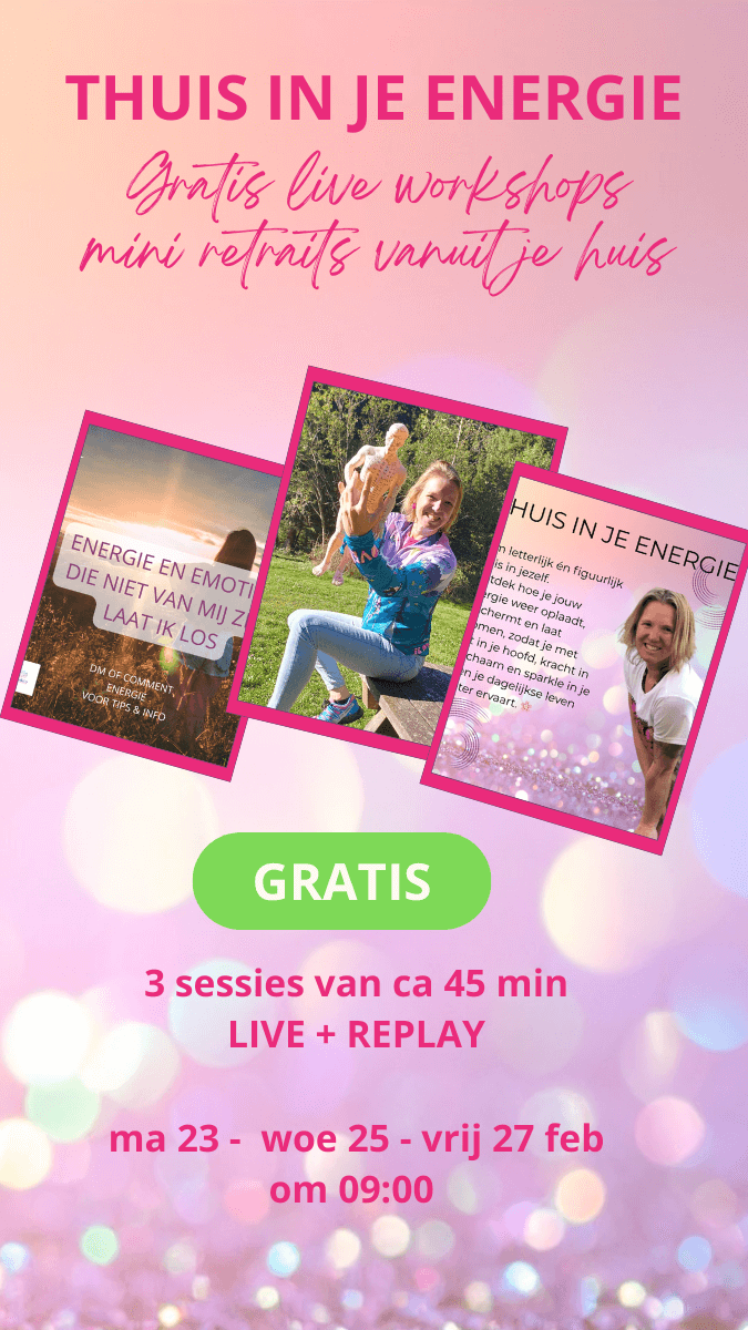 Ben jij vaak aan het rennen, zorgen, regelen… en voel je dat je energie weglekt? In Thuis in je Energie zak je terug in je lichaam en leer je eenvoudige micro-rituelen die je batterij sneller én dieper opladen, zodat je niet leegloopt, maar overvloed voelt.
